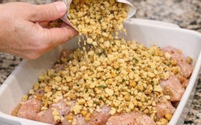 La mamma cosparge il ripieno secco sul pollo crudo in una pirofila. Il sapore è molto più buono di quanto sembri.