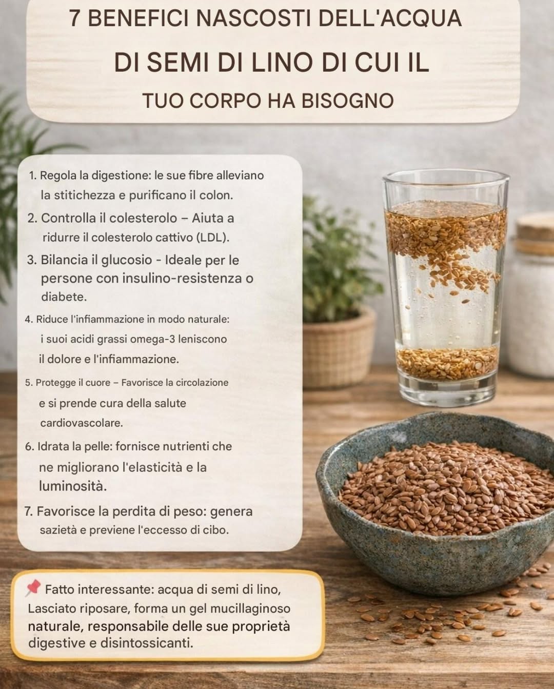 I semi di lino sono piccoli ma potenti. Quando vengono immersi in acqua, rilasciano composti che molti trascurano. Come spiega la tua guida naturale, l'acqua di semi di lino non è una nuova moda: è stata tradizionalmente utilizzata per favorire la digestione e il metabolismo.