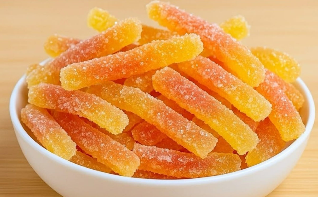 Posizionare l'anguria su una griglia da forno e cuocere a 50 °C per 2 ore. Infine, immergere le scorze nello zucchero.