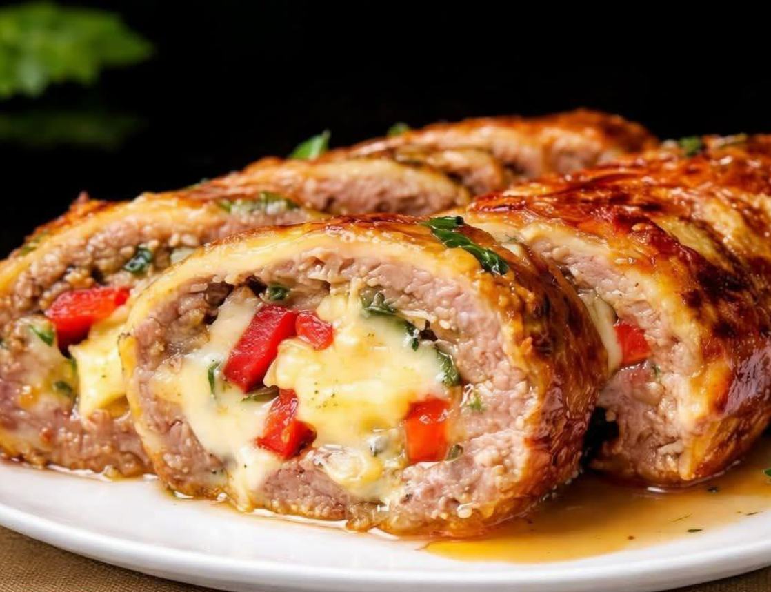 Un succulento involtino di carne al forno, ripieno di formaggio fuso e peperoni, perfetto per un pasto abbondante in famiglia.